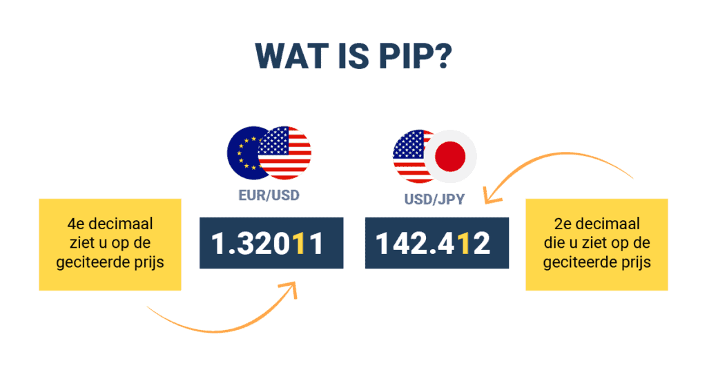 De prijsveranderingen worden gemeten in pips (percentage in punten). Voor de meeste paren is een pip het vierde cijfer achter de komma van de koers. Ook de brokerskosten worden doorgaans in pips uitgedrukt, maar daar gaan we later in deze gids dieper op in.