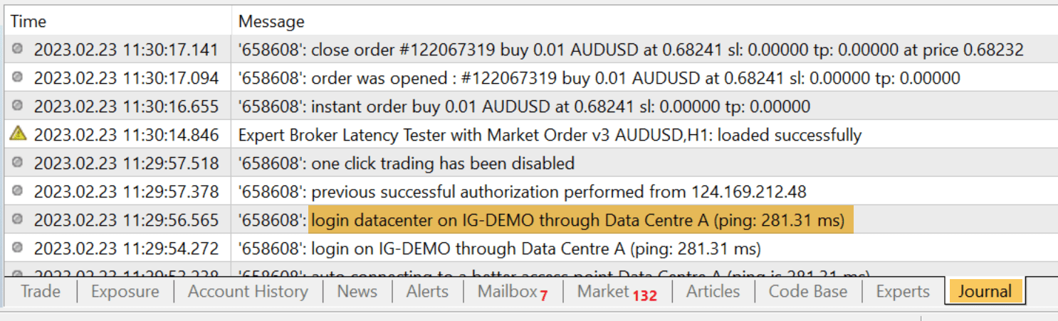 For market orders, we used the MT4 EA known as Broker Latency Tester. This EA sends a market order and calculates the time between sending the order and receiving the confirmation. After confirmation, the position is closed. The average response time is calculated across 20 trades at a lot size of MODE_MINLOT (the minimum amount allowed by the broker).