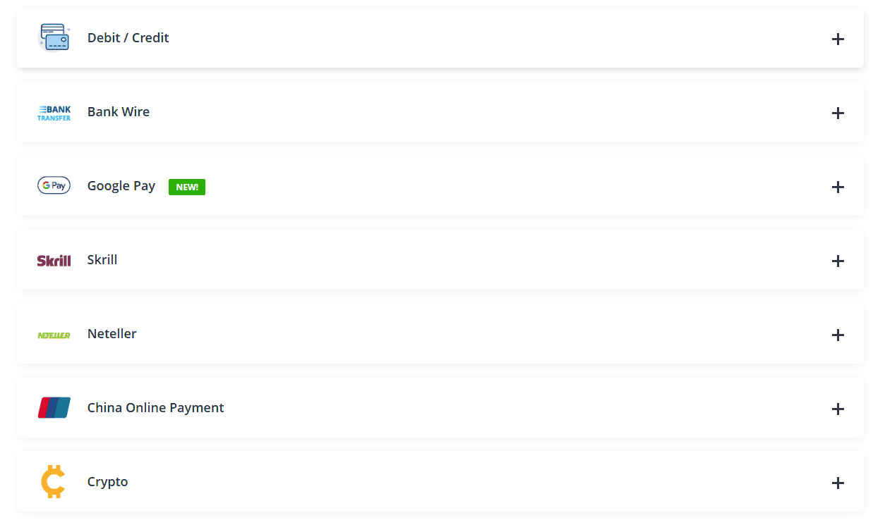 - FXCM ยังรับการฝากเงินผ่าน Google Pay, Skrill และ Neteller (ด้วยวงเงิน $20,000 ต่อเดือนสำหรับบริการ e-wallet เหล่านี้**)